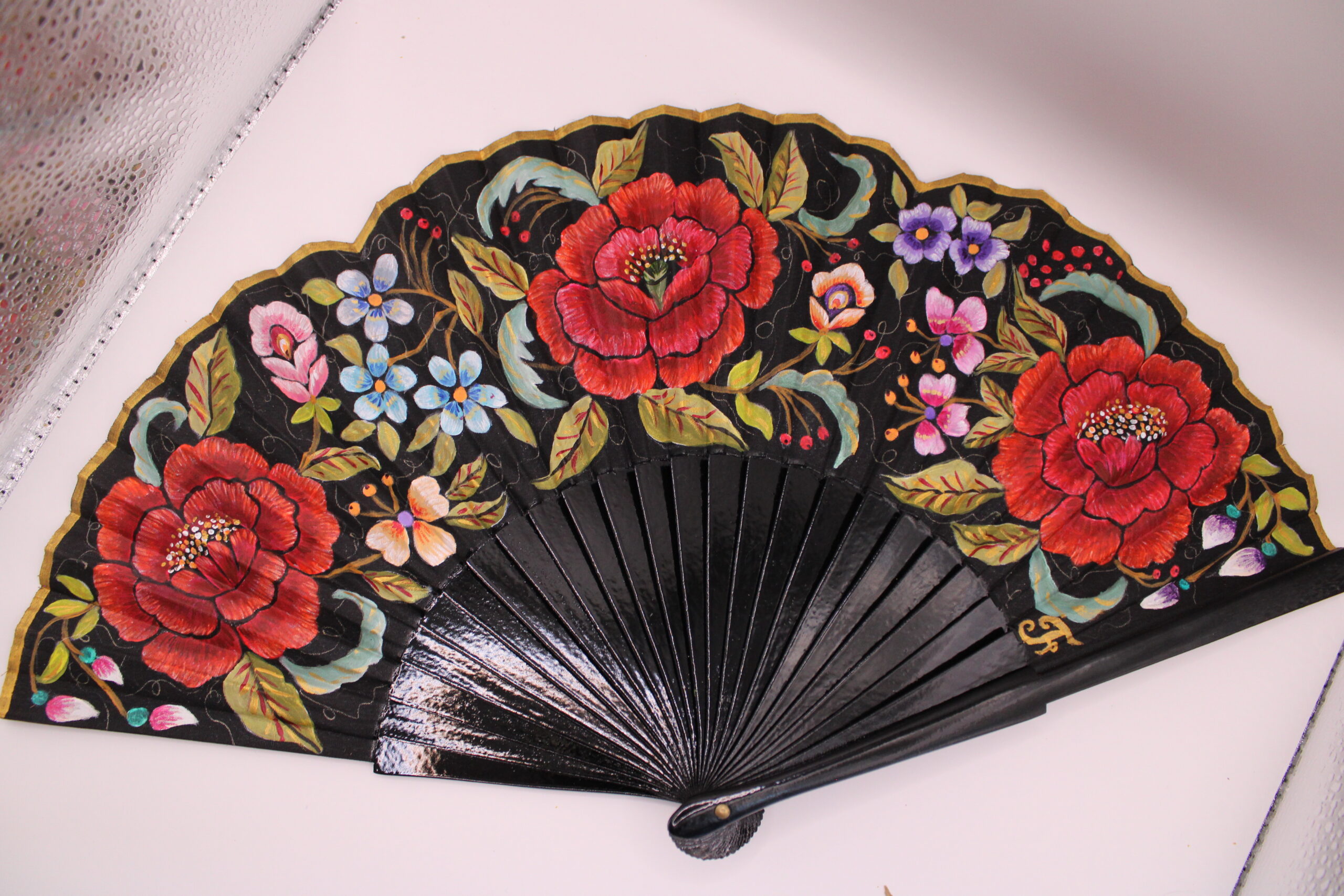 Abanico de borde ondulado pintado a mano con flores tipo mantón color rojo