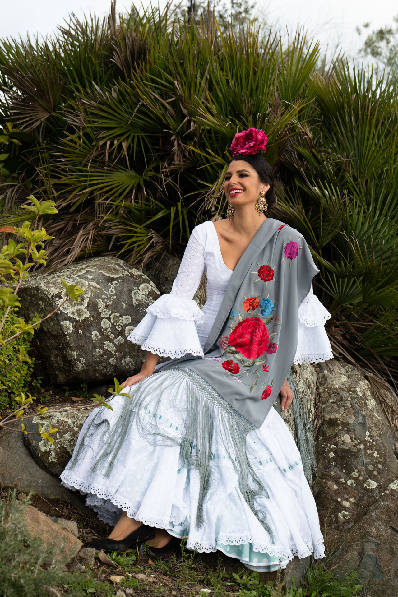 Elegante Chal gris bordado en tonos fresa y flecado en gris. Realizado por manos bordadoras artesanas en Sevilla. Tamaño aproximado de largo 150cm. Flecado a mano con magnífico enrejado. Es maravilloso, muy combinable y elegante. Ideal para completar tu look de invitada.