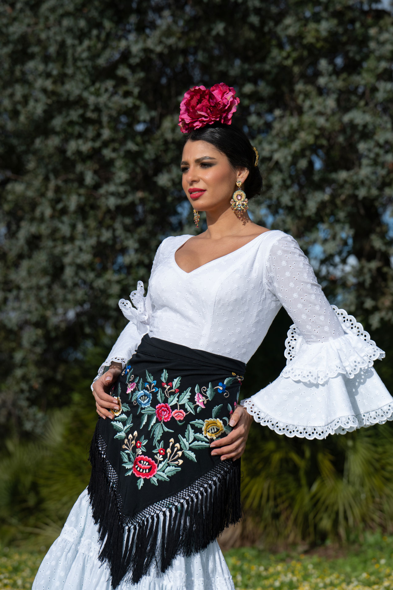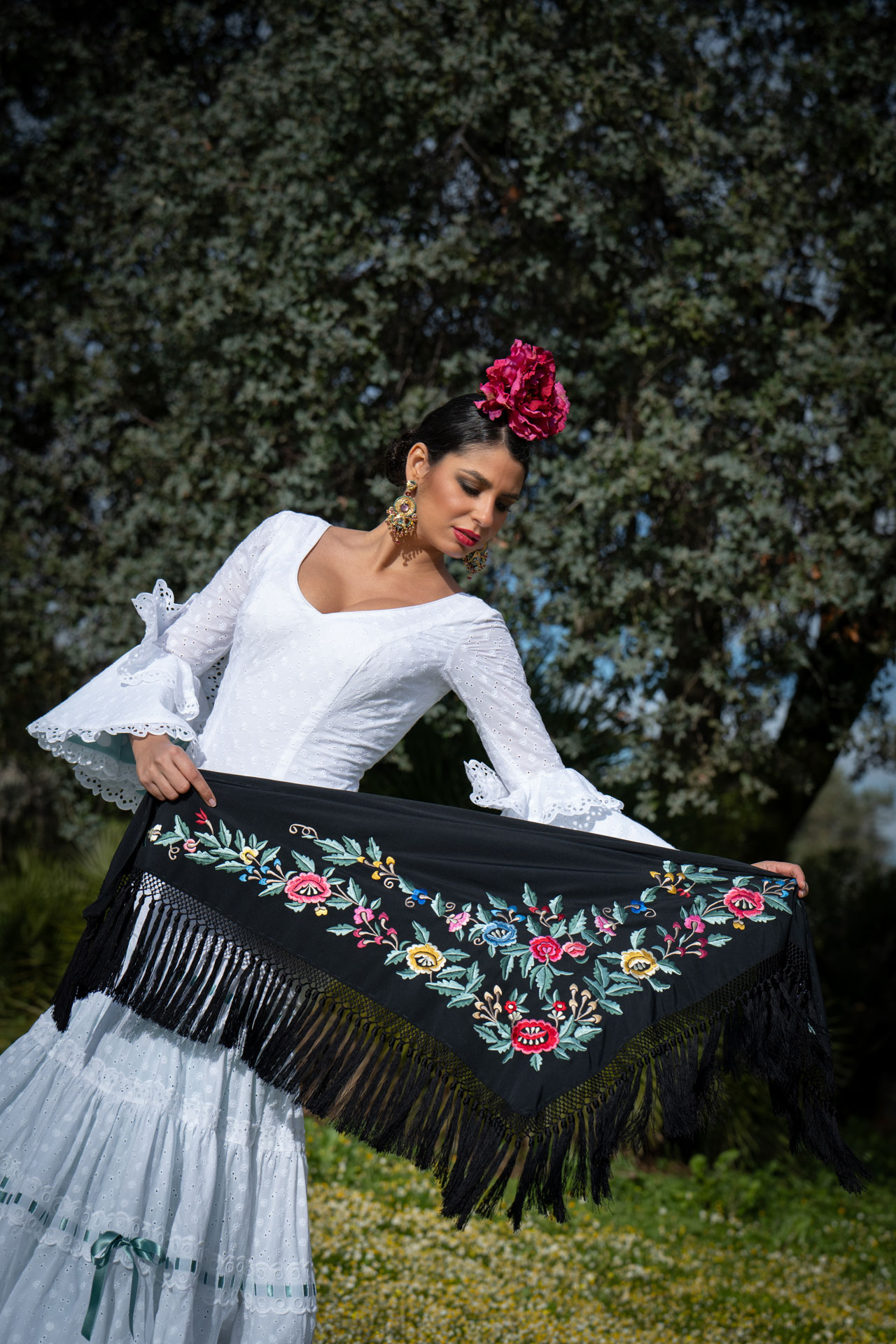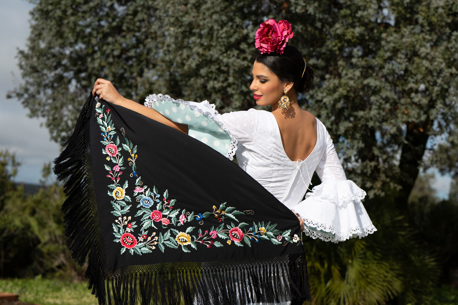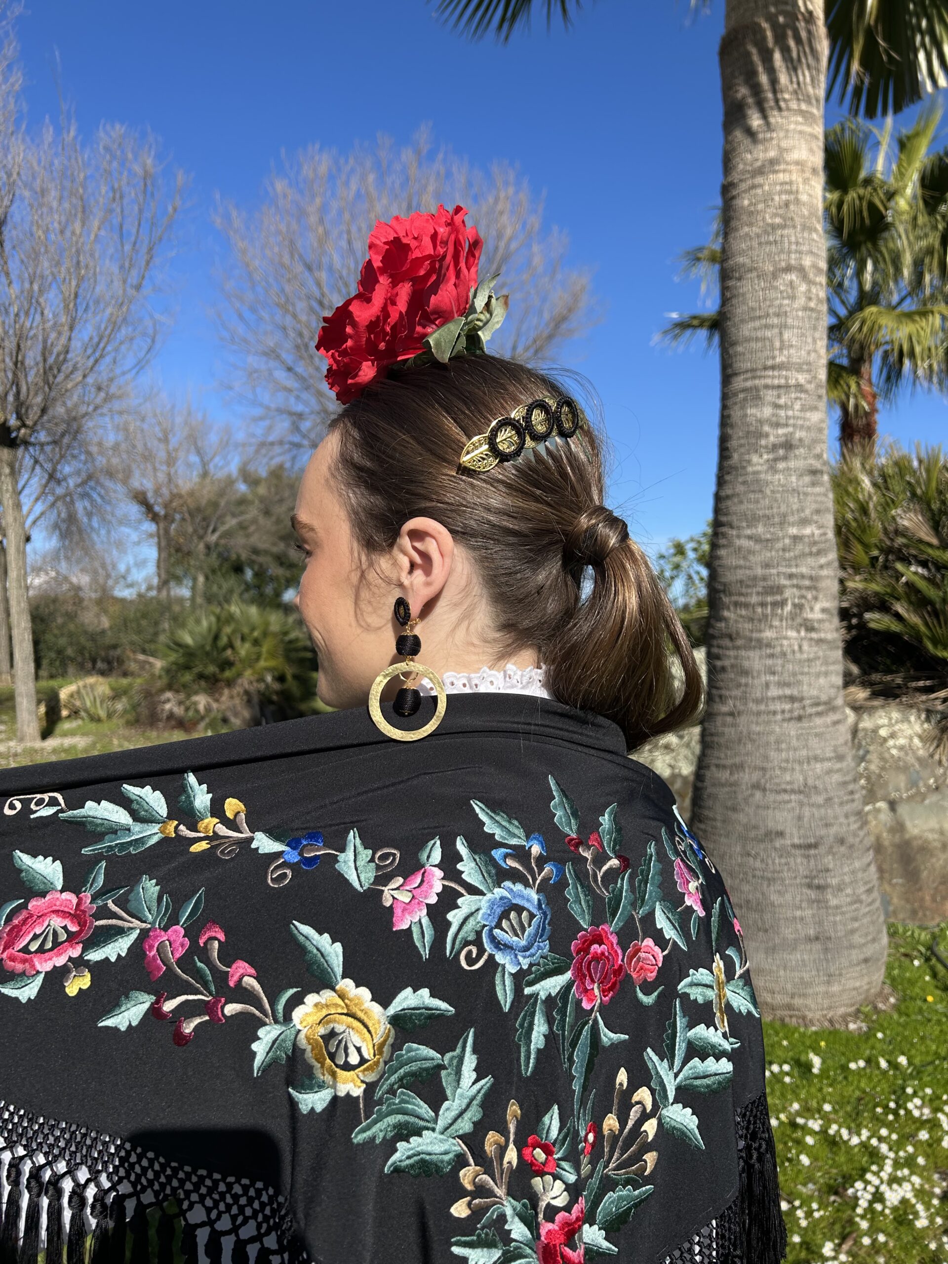 Precioso Mantoncillo Fabiola1987 Colección Jardín fondo negro bordado en colores sobre tejido de crespón de alta calidad. Bordado al estilo tradicional con bastidor a máquina, uno a uno y flecado a mano. Totalmente artesanal y de alta calidad. Edición limitada. Cómodo y ligero. Fácil de llevar. Para lucir aportando valor a tu traje de flamenca. También para llevar en eventos y looks veraniegos.