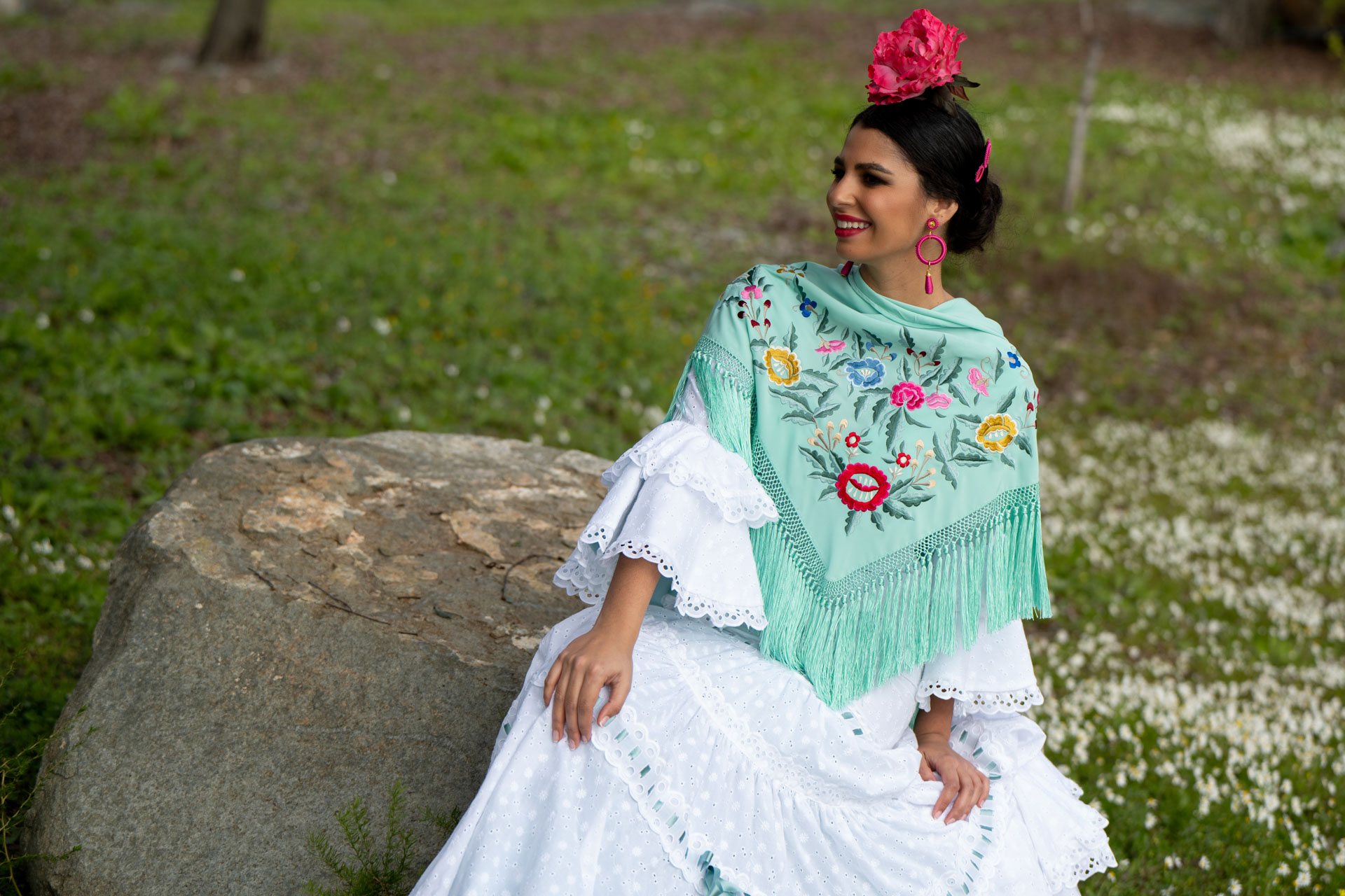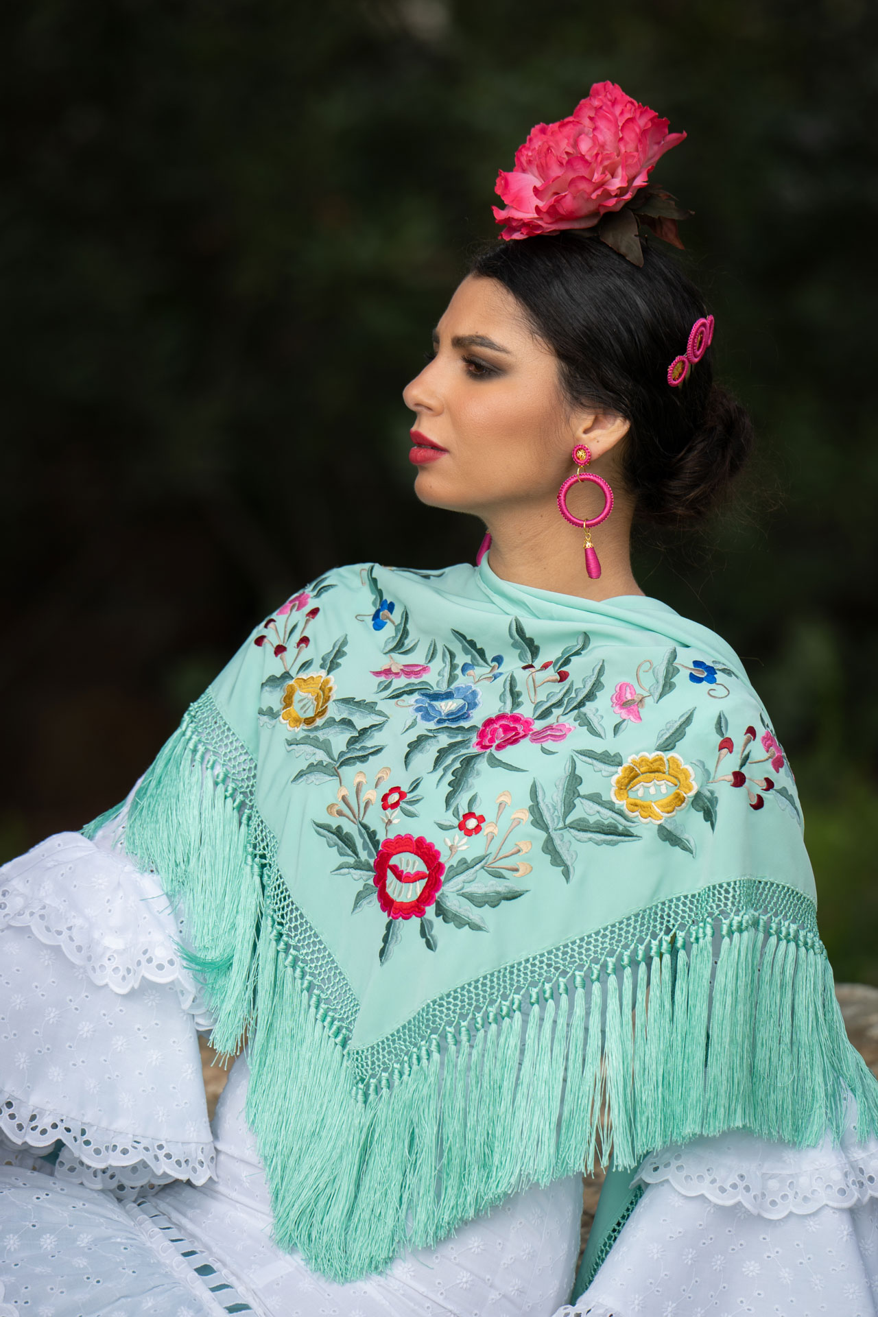 Mantoncillo Fabiola1987 Colección Jardín fondo verde agua bordado en colores sobre tejido de crespón de alta calidad. Bordado al estilo tradicional con bastidor a máquina, uno a uno y flecado a mano. Totalmente artesanal y de alta calidad. Medidas aproximadas de cada mantoncillo: Se trata de un triángulo que tiene 2 lados iguales de 95cm, el lado mayor de 134 cm y de altura mide 72 cm.