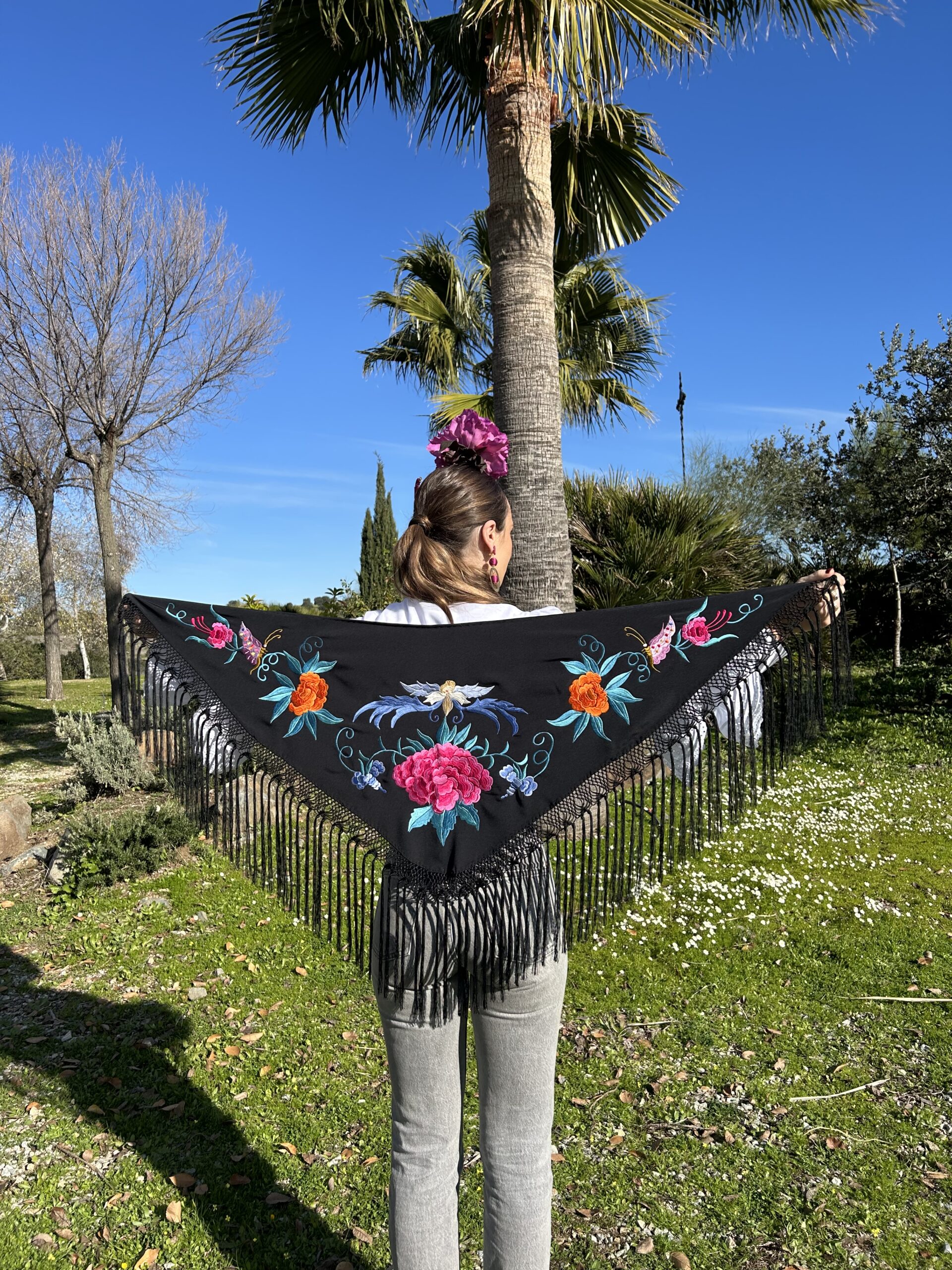 Precioso Mantoncillo de Fabiola1987 Colección Rosas fondo negro bordado en colores. Tejido crespón de alta calidad. Enrejado a mano. Bordado en Sevilla «a bastidor «en máquina, al estilo tradicional. Bordado lento y detallado, uno a uno. Colección exclusiva de Fabiola1987.#Hecho en España. Edición limitada. Cómodo y ligero. Fácil de llevar. Para lucir aportando valor a tu traje de flamenca. También para llevar en eventos y looks veraniegos.